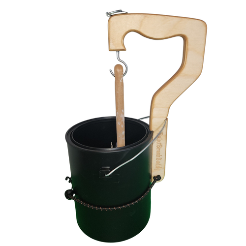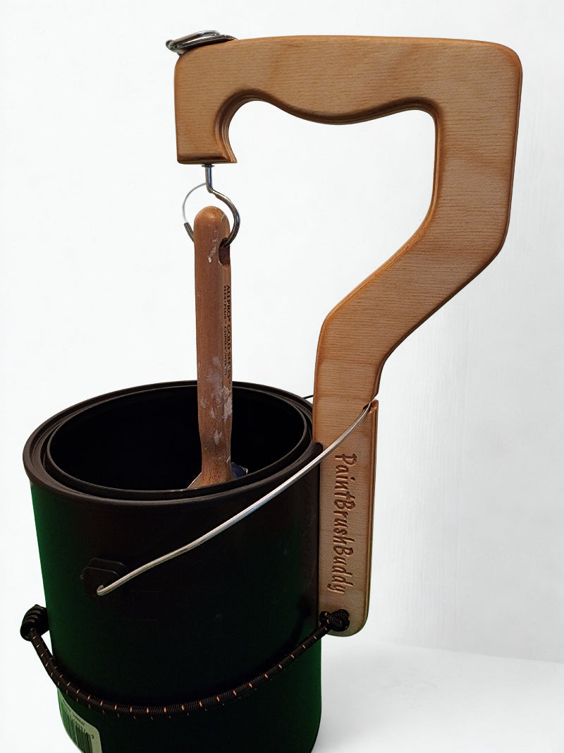 PaintBrushBuddy replaces the thin wire handle on a standard 1-gallon paint can with a comfortable grip — and gives your brush a safe place to hang inside the can when you need to pause.